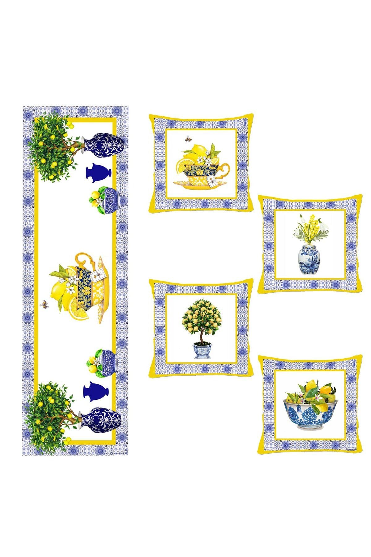 Limon Serisi Bleu Blanc Kenarlı 4lü Kırlent Kılıfı ve Runner Seti No:120SETNO120