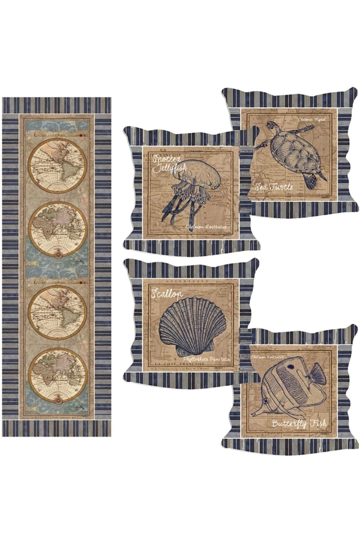 Marin Deniz Desen Model : 9 4lü Kırlent Kılıfı Ve Runner Seti No:304